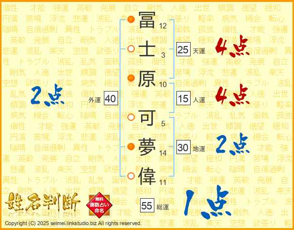 冨(12画)士(3画)原(10画) 可(5画)夢(14画)偉(11画)