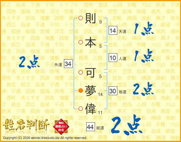 則本可夢偉さんの天運は14画の1点!