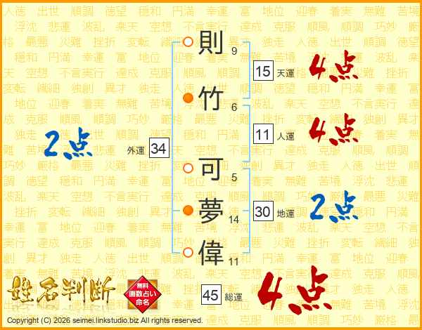則(9画)竹(6画) 可(5画)夢(14画)偉(11画)