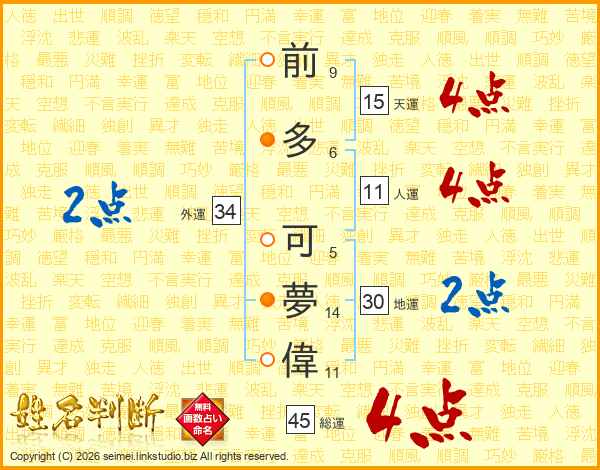 前(9画)多(6画) 可(5画)夢(14画)偉(11画)