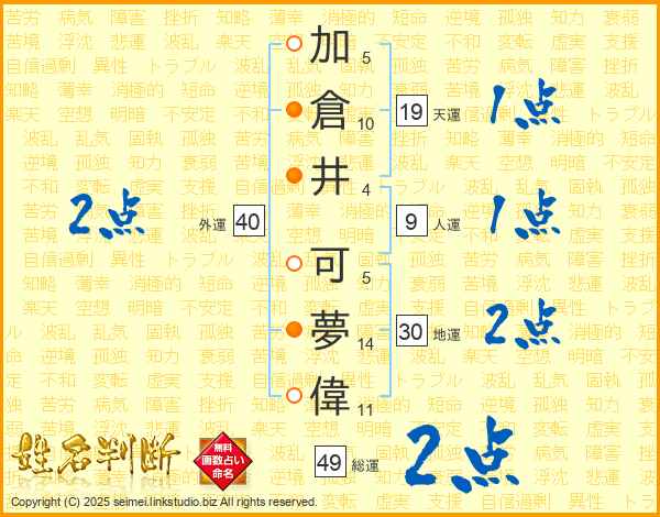 加(5画)倉(10画)井(4画) 可(5画)夢(14画)偉(11画)