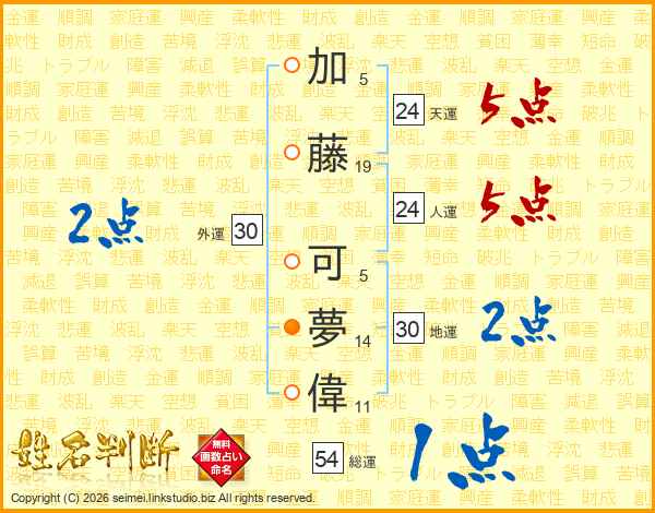 加(5画)藤(19画) 可(5画)夢(14画)偉(11画)