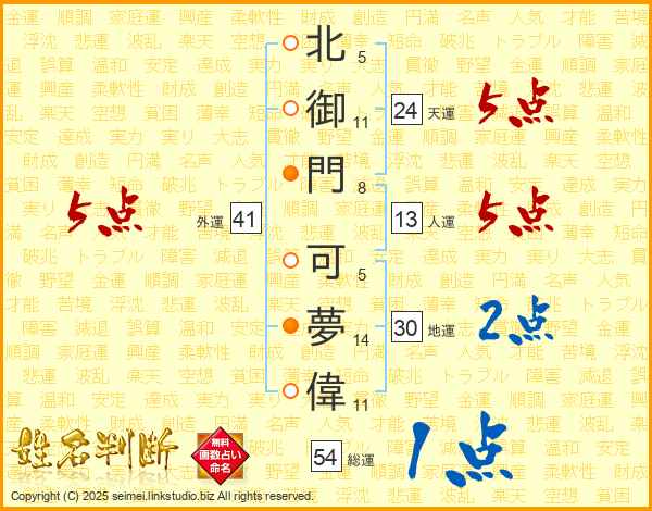 北(5画)御(11画)門(8画) 可(5画)夢(14画)偉(11画)