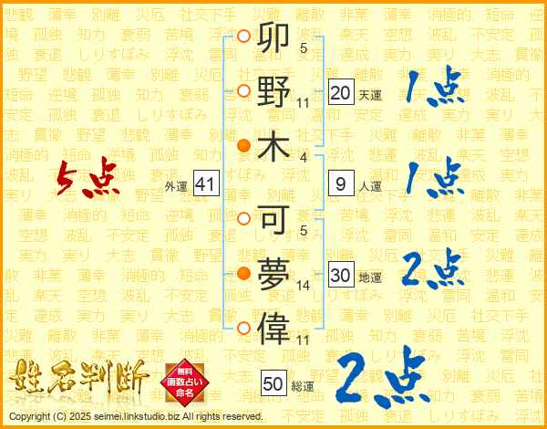 卯(5画)野(11画)木(4画) 可(5画)夢(14画)偉(11画)