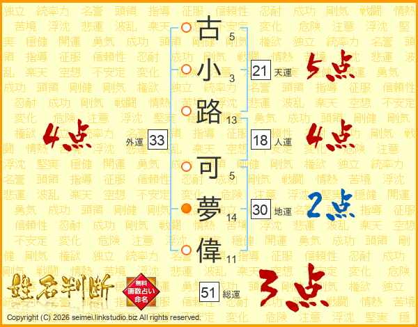 古(5画)小(3画)路(13画) 可(5画)夢(14画)偉(11画)