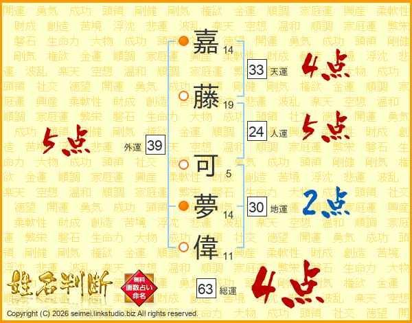 嘉(14画)藤(19画) 可(5画)夢(14画)偉(11画)