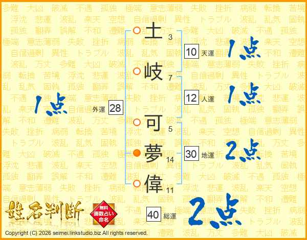 土(3画)岐(7画) 可(5画)夢(14画)偉(11画)