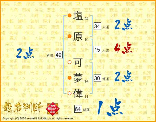 塩(24画)原(10画) 可(5画)夢(14画)偉(11画)