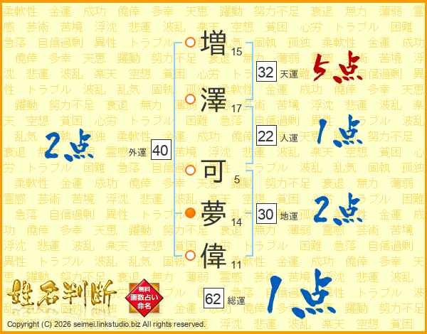 増(15画)澤(17画) 可(5画)夢(14画)偉(11画)