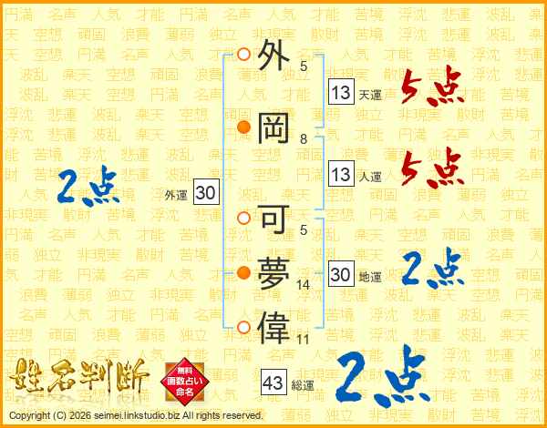 生活面を象徴する運勢です。外部から受ける影響力を表し、結婚運、家庭運や職場、環境への順応性を表します。総運から人運を引いた画数。姓や名が1文字の場合を除く。