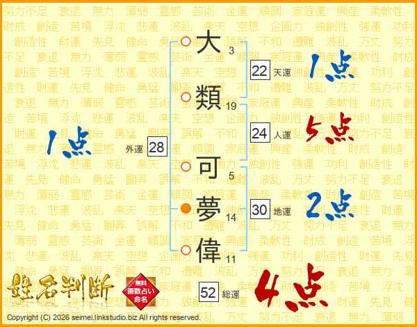 大(3画)類(19画) 可(5画)夢(14画)偉(11画)
