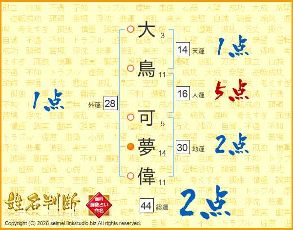 大鳥可夢偉さんの総運は44画の2点!