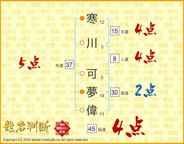 寒(12画)川(3画) 可(5画)夢(14画)偉(11画)