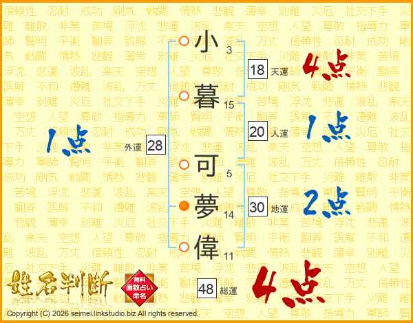 小(3画)暮(15画) 可(5画)夢(14画)偉(11画)