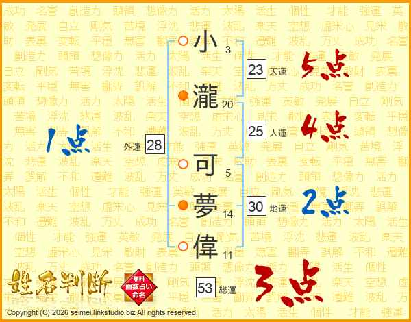 小(3画)瀧(20画) 可(5画)夢(14画)偉(11画)