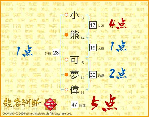 小(3画)熊(14画) 可(5画)夢(14画)偉(11画)