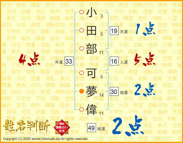 小(3画)田(5画)部(11画) 可(5画)夢(14画)偉(11画)