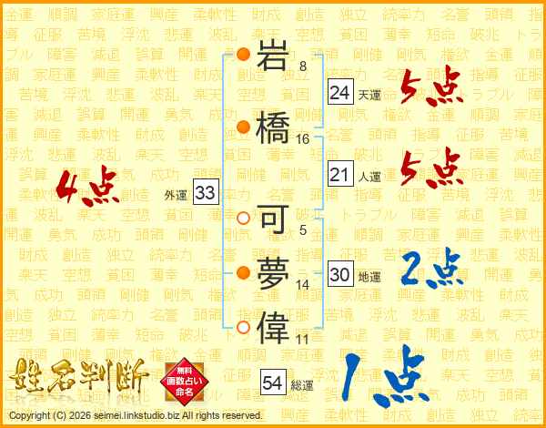 岩(8画)橋(16画) 可(5画)夢(14画)偉(11画)