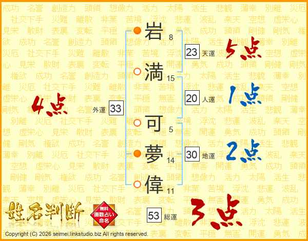 岩(8画)満(15画) 可(5画)夢(14画)偉(11画)