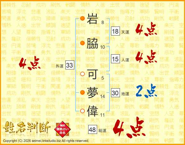 岩(8画)脇(10画) 可(5画)夢(14画)偉(11画)