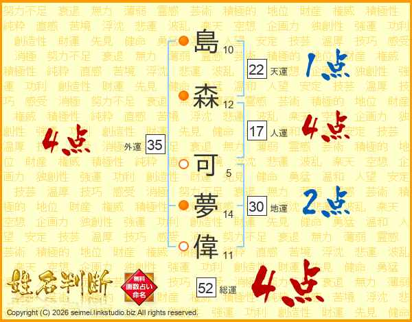 島森可夢偉さんの総運は52画の4点!
