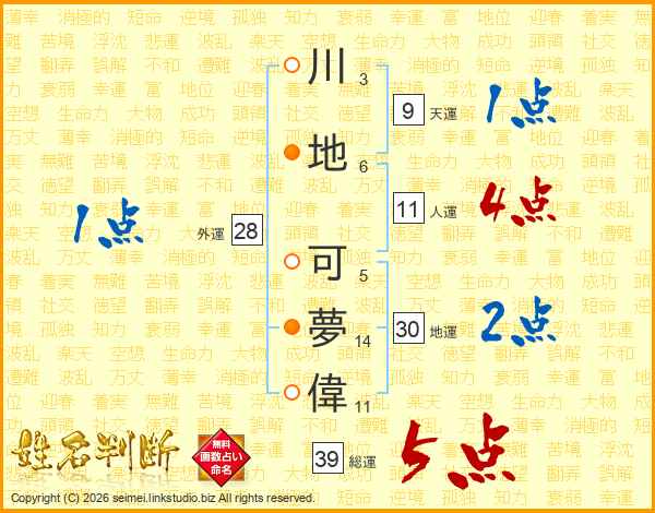 川地可夢偉さんの総運は39画の5点!
