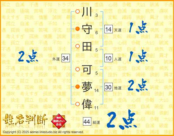 川(3画)守(6画)田(5画) 可(5画)夢(14画)偉(11画)