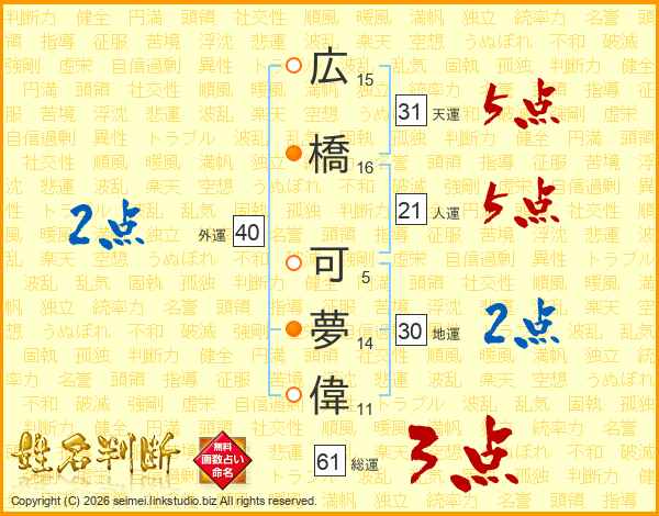 広橋可夢偉さんの総運は61画の3点!
