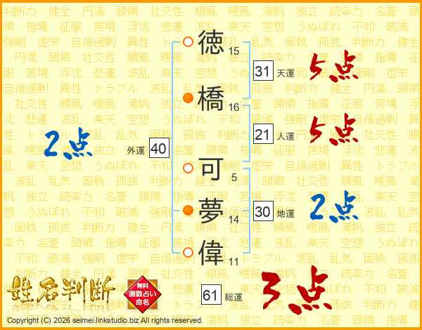 徳橋可夢偉さんの人運は21画の5点!