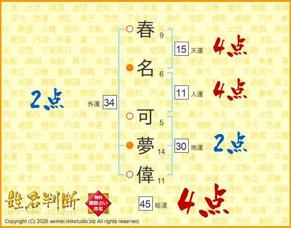 春名可夢偉さんの総運は45画の4点!