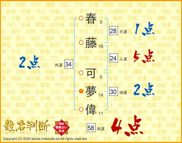 春(9画)藤(19画) 可(5画)夢(14画)偉(11画)
