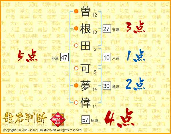 曽根田可夢偉さんの総運は57画の4点!