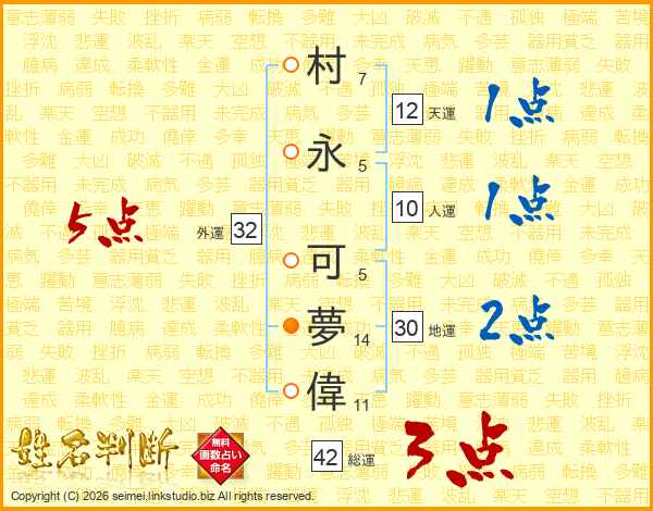 村(7画)永(5画) 可(5画)夢(14画)偉(11画)