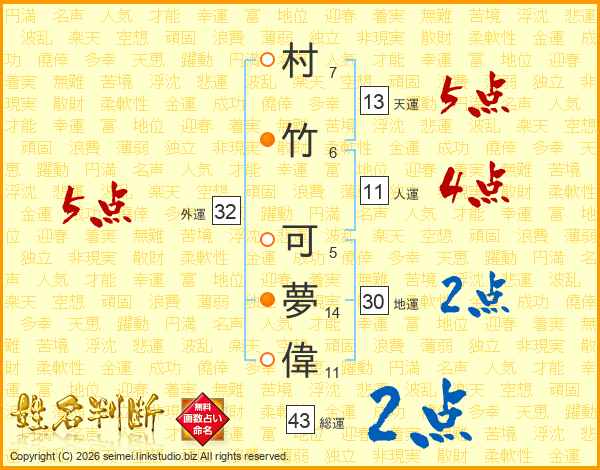 村(7画)竹(6画) 可(5画)夢(14画)偉(11画)
