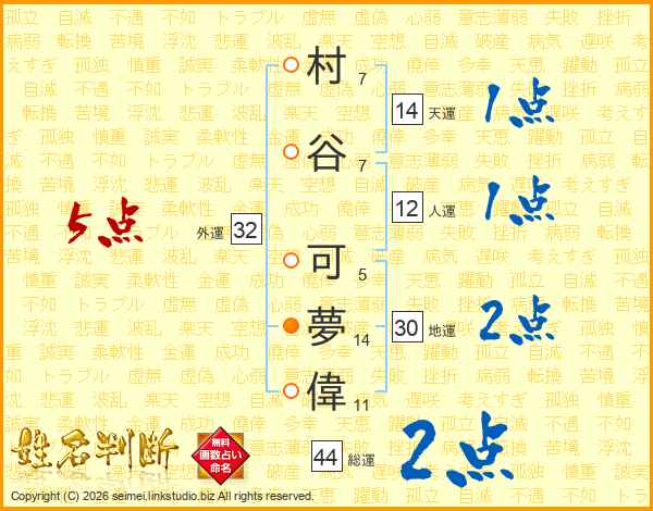 村谷可夢偉さんの総運は44画の2点!