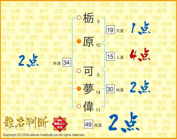 栃(9画)原(10画) 可(5画)夢(14画)偉(11画)