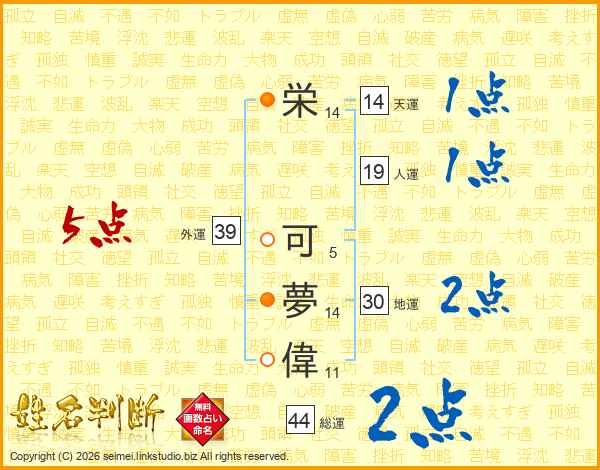栄(14画) 可(5画)夢(14画)偉(11画)