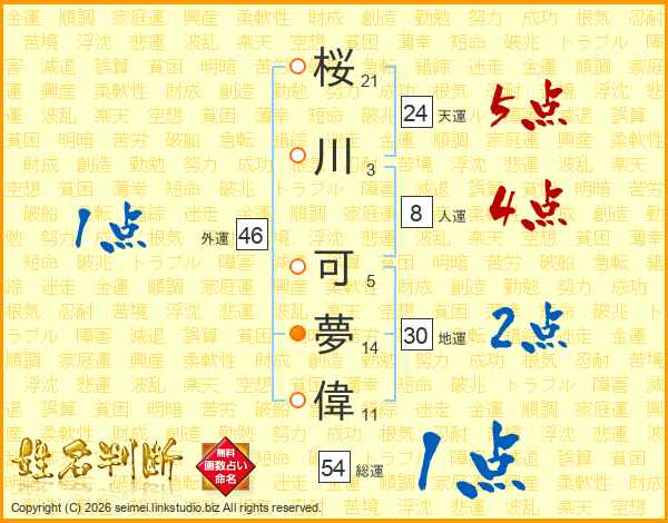 桜川可夢偉さんの総運は54画の1点!