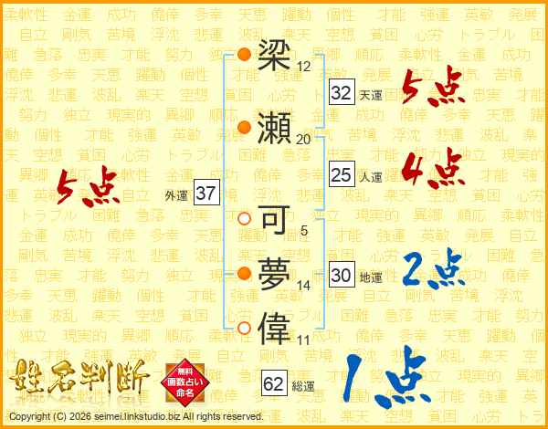 梁瀬可夢偉さんの外運は37画の5点!