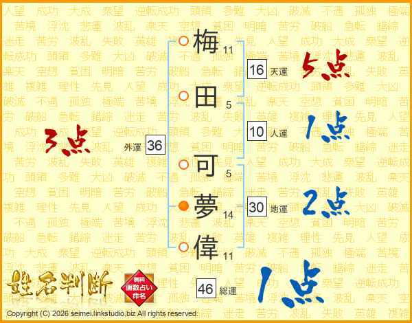 梅(11画)田(5画) 可(5画)夢(14画)偉(11画)