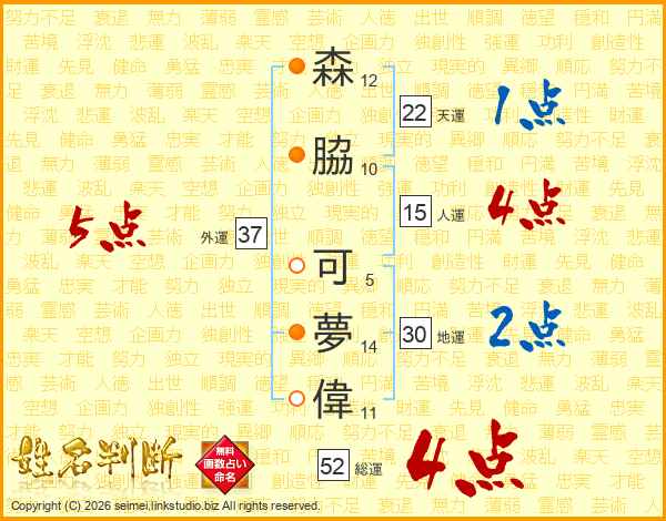 森(12画)脇(10画) 可(5画)夢(14画)偉(11画)