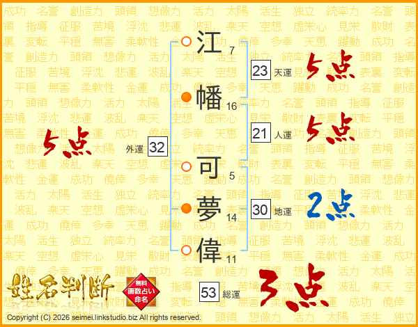 江(7画)幡(16画) 可(5画)夢(14画)偉(11画)