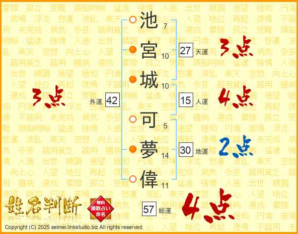 池(7画)宮(10画)城(10画) 可(5画)夢(14画)偉(11画)