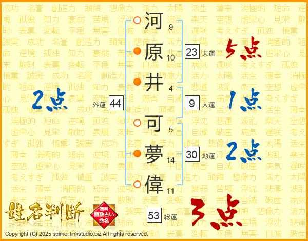 河(9画)原(10画)井(4画) 可(5画)夢(14画)偉(11画)