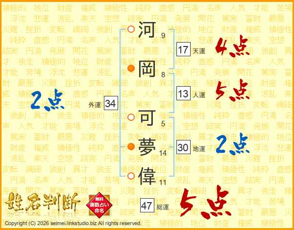 河岡可夢偉さんの総運は47画の5点!