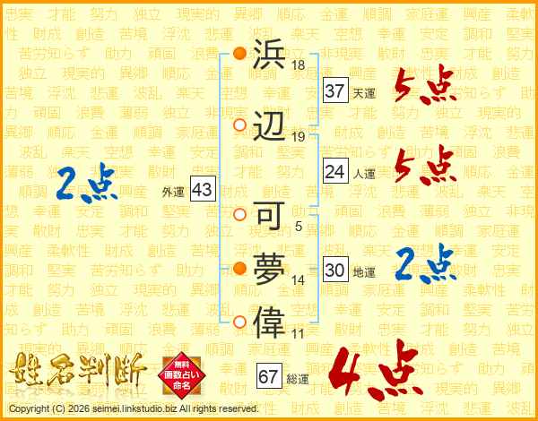 浜(18画)辺(19画) 可(5画)夢(14画)偉(11画)