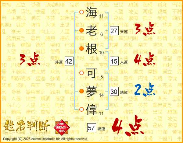 海(11画)老(6画)根(10画) 可(5画)夢(14画)偉(11画)