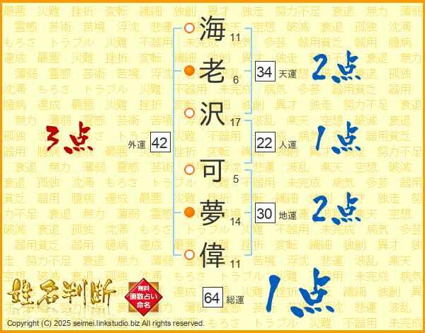 海(11画)老(6画)沢(17画) 可(5画)夢(14画)偉(11画)