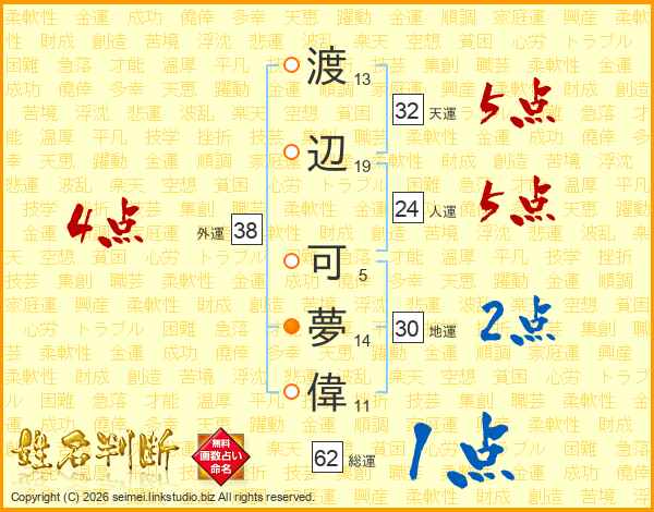 渡(13画)辺(19画) 可(5画)夢(14画)偉(11画)