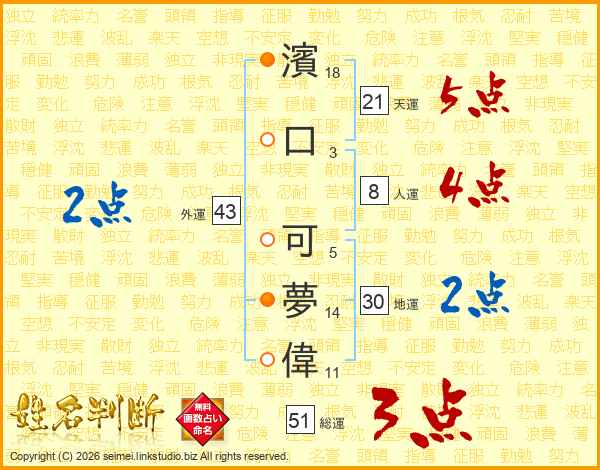 濱(18画)口(3画) 可(5画)夢(14画)偉(11画)